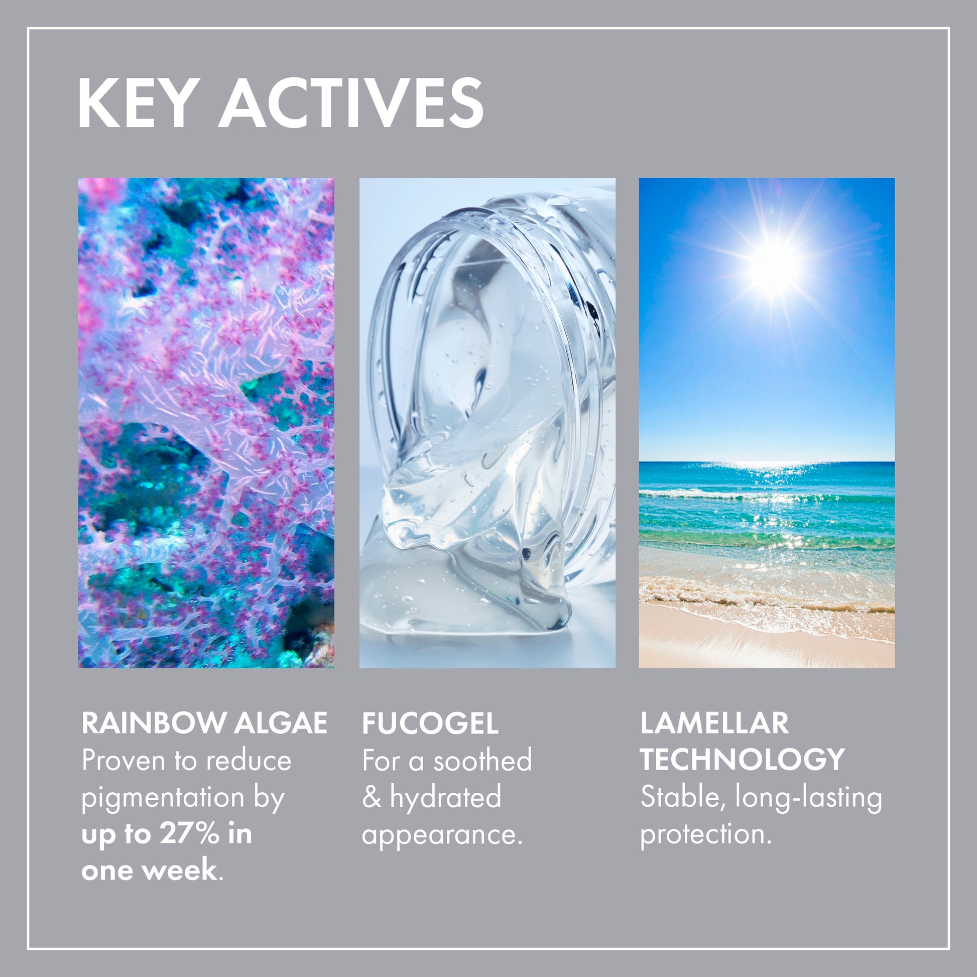 Our Face Fluid Anti Pigmentation SPF50+ is our lightest formula yet, delivering full-spectrum solar protection from the sun’s harmful rays. It's formulated with a leading-edge Rainbow Algae, which is proven to reduce pigmentation by up to 27% in just one week, along with Fucogel for a soothed and hydrated complexion! This extremely lightweight, easily absorbed, non-comedogenic SPF is suitable for even the most sensitive skin. Our all-in-one primer, moisturiser, targeted treatment, and SPF is perfect for everyday use.