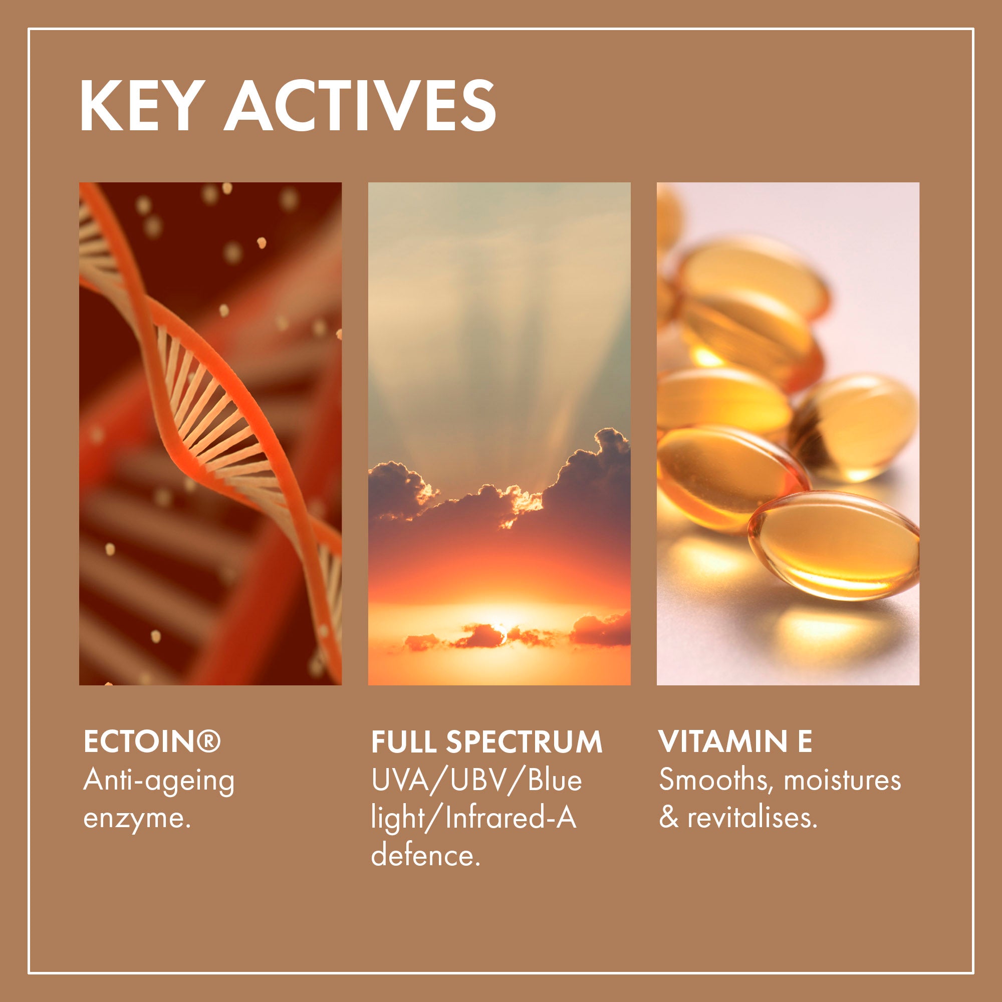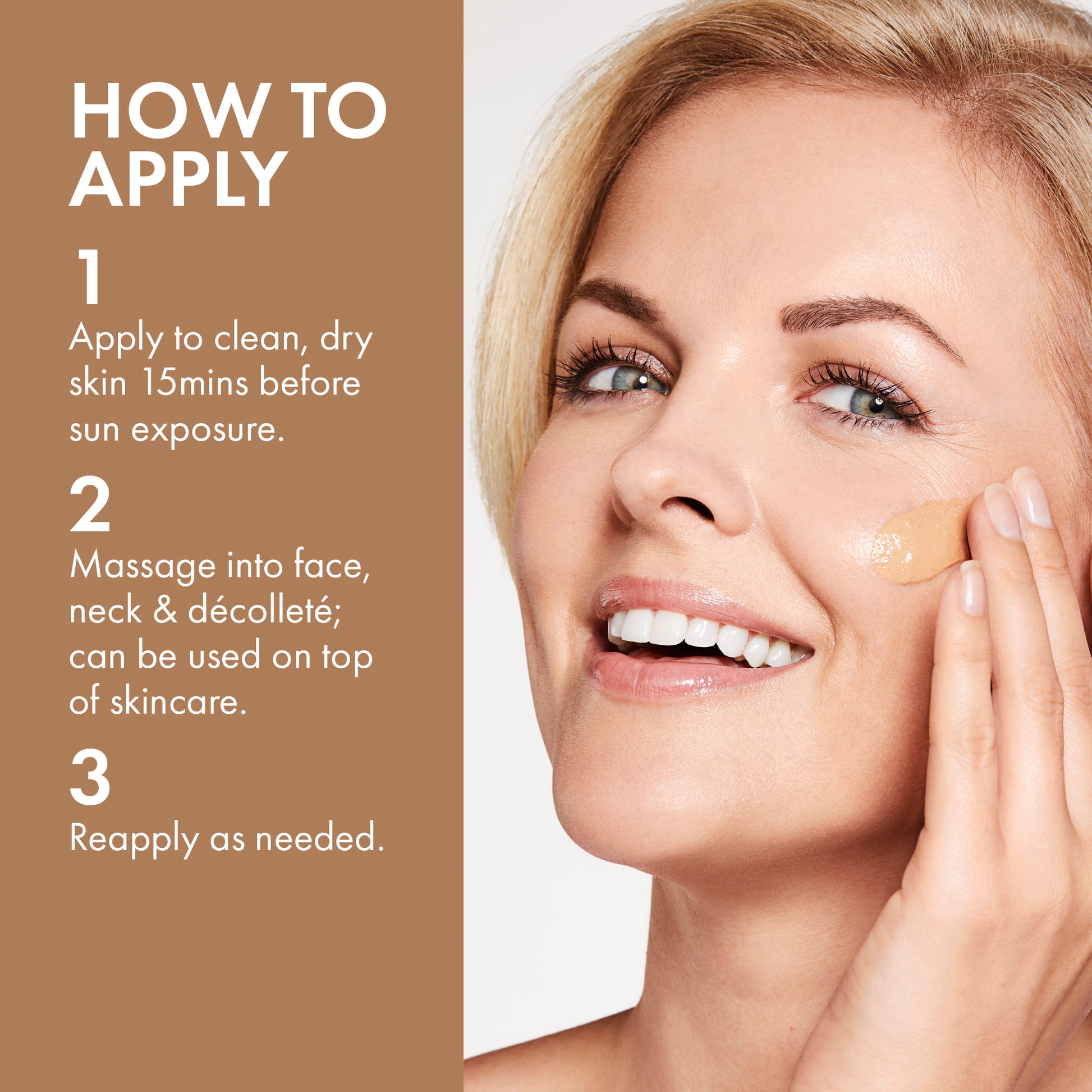 Can be applied as part of your daily skincare regime. Apply to clean dry skin 15 minutes before sun exposure. Massage into the face, neck and décolleté. Can be used on top of skin care.